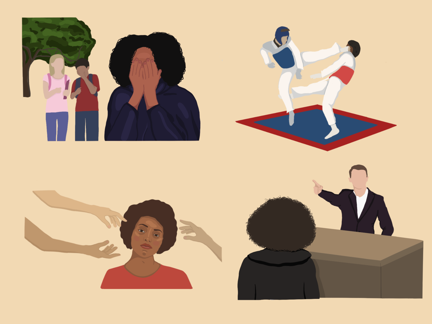 En grandissant, ces personnes peuvent faire face à des discriminations dans des lieux de socialisation. Le premier d’entre-eux est l’école. Dans des établissements scolaires où la mixité sociale est moindre, certains enfants se retrouvent être les seuls à avoir les cheveux non-raides. C’est le cas de Noal Mendy qui a grandi en Moselle, où, avec sa soeur, elles étaient les uniques personnes noires du village. « Pour ma part, c’était ma mère qui était blanche. Elle avait aussi les cheveux lisses. Donc toutes les figures féminines autour de moi avaient les cheveux lisses, et ça m’a très vite complexée », témoigne la jeune fille.