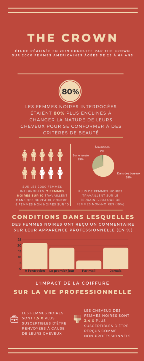 La coalition souhaite que les femmes noires puissent être libérées de cet impératif vis-à-vis de leur coiffure au travail. À 53 ans, Kelli Lawson explique que pendant 45 ans de sa vie, elle s’est conformée aux standards de beauté en lissant chimiquement ses cheveux. « Ce n'est qu'il y a quelques années que j'ai vraiment commencé à ressentir la liberté de porter mes cheveux tels qu'ils poussent sur ma tête », confie-t-elle. Afin de prouver la nécessité de ce projet de loi, The CROWN a réalisé une étude sur 2000 femmes, qui conclut que les femmes noires ont 80 % de chances en plus de changer la nature de leurs cheveux pour se conformer à des critères de beauté.